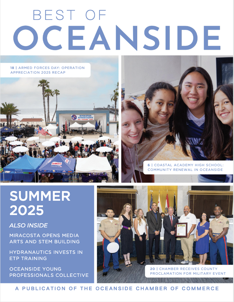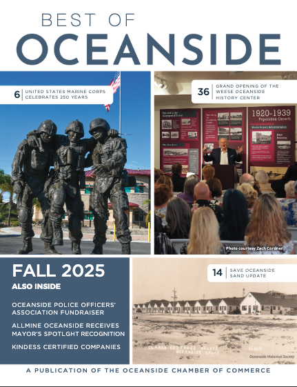 is a quarterly magazine that celebrates the vibrant spirit of our community. Directly mailed to homes and businesses throughout Oceanside and distributed on Camp Pendleton, each edition offers a rich mix of stories that matter to residents, local businesses, and those who work and do business in the area. From human interest pieces to profiles of local businesses, arts & culture highlights, and upcoming community events,
